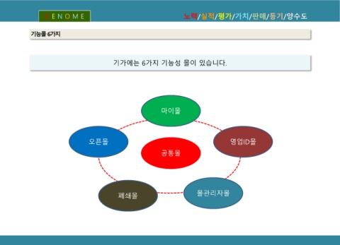 G E N O M E 노력/실적/평가/가치/판매/등기/양수도 기 능 몰 6가 지 기가에는 6가지 기능성 몰이 있습니다. 마이몰 오픈몰 영업ID몰 공통몰 폐쇄몰 몰관리자몰