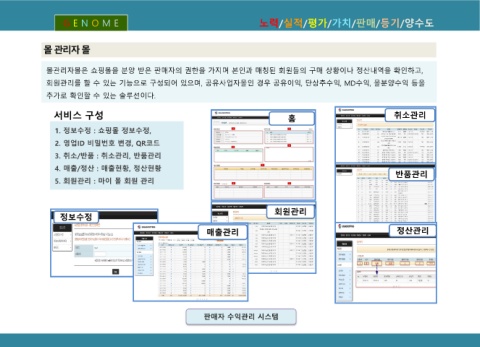 회원관리를 할 수 있는 기능으로 구성되어 있으며, 공유사업자몰인 경우 공유이익, 단상추수익, MD수익, 몰분양수익 등을