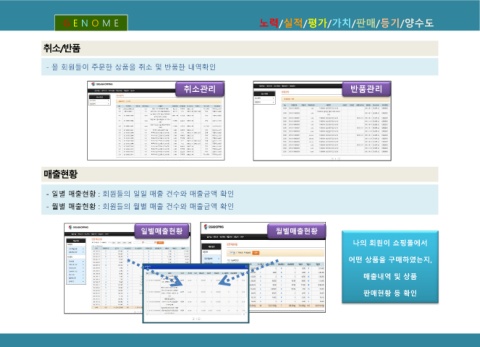 G E N O M E 노력/실적/평가/가치/판매/등기/양수도 반 취 소 / 품 - 몰 회원들이 주문한 상품을 취소 및 반품한 내역확인 취소관리 반품관리 매 출 현 황 - 일별 매출현황 : 회원들의 일일 매출 건수와 매출금액 확인 - 월별 매출현황 : 회원들의 월별 매출 건수와 매출금액 확인 일별매출현황 월별매출현황 나의 회원이 쇼핑몰에서 어떤 상품을 구매하였는지, 매출내역 및 상품 판매현황 등 확인
