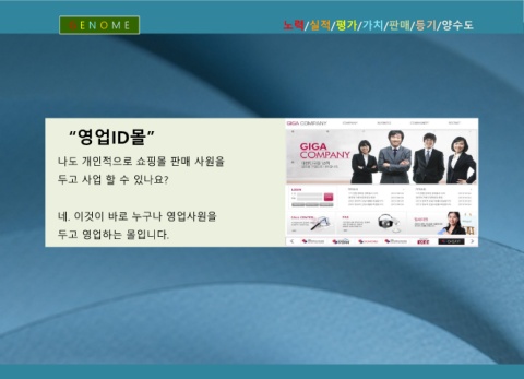 G E N O M E 노력/실적/평가/가치/판매/등기/양수도 “영업ID몰” 나도 개인적으로 쇼핑몰 판매 사원을 두고 사업 할 수 있나요? 네. 이것이 바로 누구나 영업사원을 두고 영업하는 몰입니다.