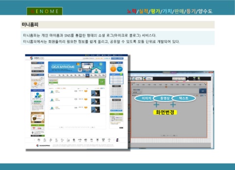 G E N O M E 노력/실적/평가/가치/판매/등기/양수도 미 니 홈 피 미니홈피는 개인 마이홈과 SNS를 통합한 형태의 소셜 로그(마이크로 블로그) 서비스다. 미니홈피에서는 회원들끼리 필요한 정보를 쉽게 올리고, 공유할 수 있도록 모듈 단위로 개발되어 있다. + + 이미지 동영상 텍스트 화면변경