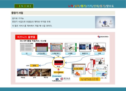 G E N O M E 노력/실적/평가/가치/판매/등기/양수도 중 장 기 사 업 앞으로 기가는 중장기 사업으로 회원들의 재미와 이익을 위해 더 많은 서비스를 계속해서 개발 해 나갈 것이다. 비즈니스 플랫폼