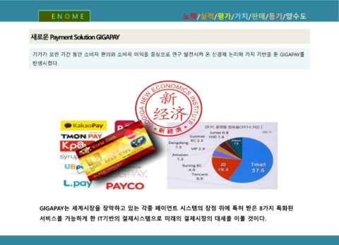 G E N O M E 노력/실적/평가/가치/판매/등기/양수도 새 로 운 Payment Solution GIGAPAY 기가가 오랜 기간 동안 소비자 편의와 소비자 이익을 중심으로 연구 발전시켜 온 신경제 논리에 가치 기반을 둔 GIGAPAY를 탄생시켰다. GIGAPAY는 세계시장을 장악하고 있는 각종 페이먼트 시스템의 장점 위에 특허 받은 8가지 특화된 서비스를 가능하게 한 IT기반의 결제시스템으로 미래의 결제시장의 대세를 이룰 것이다.