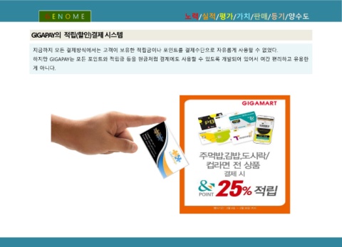 G E N O M E 노력/실적/평가/가치/판매/등기/양수도 GIGAPAY의 적 립 (할 인 )결 제 시 스 템 지금까지 모든 결제방식에서는 고객이 보유한 적립금이나 포인트를 결제수단으로 자유롭게 사용할 수 없었다. 하지만 GIGAPAY는 모든 포인트와 적립금 등을 현금처럼 결제에도 사용할 수 있도록 개발되어 있어서 여간 편리하고 유용한 게 아니다.