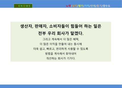 G E N O M E 노력/실적/평가/가치/판매/등기/양수도 생산자, 판매자, 소비자들이 힘들어 하는 일은 전부 우리 회사가 맡겠다. 그리고 계속해서 더 많은 혜택, 더 많은 이익을 만들어 내는 동시에 더욱 쉽고, 빠르고, 편리하게 사용할 수 있도록 방법을 계속해서 찾아내어 개선하는 회사가 기가다.