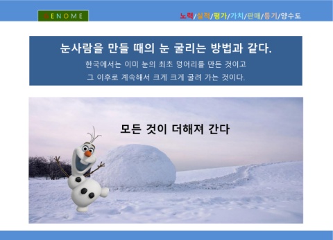 G E N O M E 노력/실적/평가/가치/판매/등기/양수도 눈사람을 만들 때의 눈 굴리는 방법과 같다. 한국에서는 이미 눈의 최초 덩어리를 만든 것이고 그 이후로 계속해서 크게 크게 굴려 가는 것이다. 모든 것이 더해져 간다