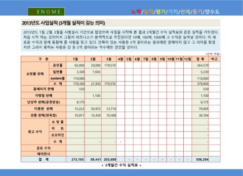 2013년도 1월, 2월, 3월을 시범실시 기간으로 잡았으며 사업을 시작해 본 결과 3개월간 수익 실적표와 같은 실적을 거두었다.