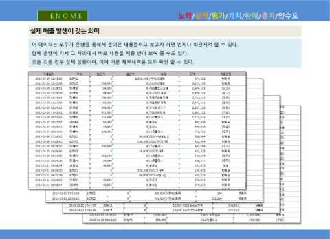 G E N O M E 노력/실적/평가/가치/판매/등기/양수도 실 제 매 출 발 생 이 갖 는 의 미 이 데이터는 모두가 은행을 통해서 들어온 내용들이고 보고자 하면 언제나 확인시켜 줄 수 있다. 함께 은행에 가서 그 자리에서 바로 내용을 제출 받아 보여 줄 수도 있다. 모든 것은 전부 실제 상황이며, 이에 따른 재무내역을 모두 확인 할 수 있다.