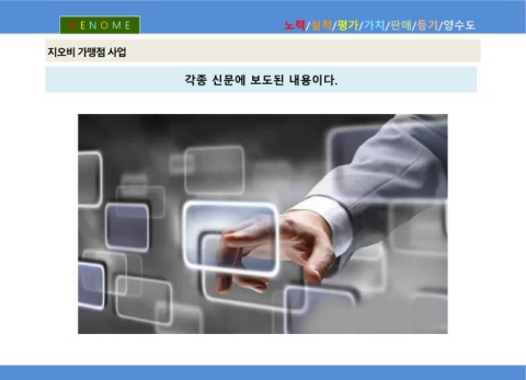 G E N O M E 노력/실적/평가/가치/판매/등기/양수도 지 오 비 가 맹 점 사 업 각종 신문에 보도된 내용이다.