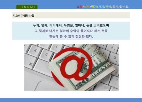 G E N O M E 노력/실적/평가/가치/판매/등기/양수도 지 오 비 가 맹 점 사 업 누가, 언제, 어디에서, 무엇을, 얼마나, 돈을 소비했으며 그 결과로 내게는 얼마의 수익이 들어오나 하는 것을 한눈에 볼 수 있게 전산화 했다.