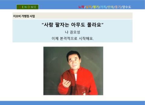 G E N O M E 노력/실적/평가/가치/판매/등기/양수도 지 오 비 가 맹 점 사 업 “사람 팔자는 아무도 몰라요” 나 권오성 이제 본격적으로 시작해요.