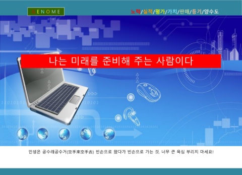 G E N O M E 노력/실적/평가/가치/판매/등기/양수도 나는 미래를 준비해 주는 사람이다 인생은 공수래공수거(空手來空手去) 빈손으로 왔다가 빈손으로 가는 것. 너무 큰 욕심 부리지 마세요!