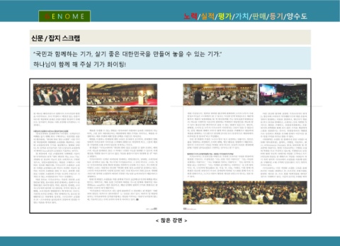 G E N O M E 노력/실적/평가/가치/판매/등기/양수도 잡 신 문 / 지 스 크 랩 “국민과 함께하는 기가, 살기 좋은 대한민국을 만들어 놓을 수 있는 기가.” 하나님이 함께 해 주실 기가 화이팅! < 많은 강연 >