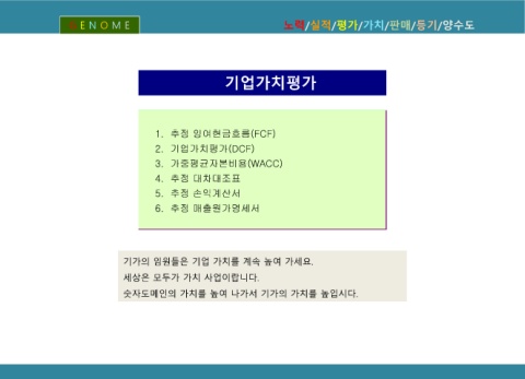 G E N O M E 노력/실적/평가/가치/판매/등기/양수도 기업가치평가 1. 추정 잉여현금흐름(FCF) 2. 기업가치평가(DCF) 3. 가중평균자본비용(WACC) 4. 추정 대차대조표 5. 추정 손익계산서 6. 추정 매출원가명세서 기가의 임원들은 기업 가치를 계속 높여 가세요. 세상은 모두가 가치 사업이랍니다. 숫자도메인의 가치를 높여 나가서 기가의 가치를 높입시다.