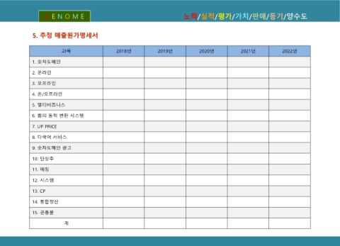 G E N O M E 노력/실적/평가/가치/판매/등기/양수도 5. 추정 매출원가명세서 과목 2018년 2019년 2020년 2021년 2022년 1. 숫자도메인 2. 온라인 3. 오프라인 4. 온/오프라인 5. 멀티비즈니스 6. 웹의 동적 변환 시스템 7. UP PRICE 8. 다국어 서비스 9. 숫자도메인 광고 10. 단상추 11. 매칭 12. 시스템 13. CP 14. 통합정산 15. 공통몰 계