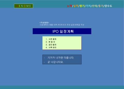 G E N O M E 노력/실적/평가/가치/판매/등기/양수도 <작성방법> 사업계획서 제출 이후 IPO까지의 주요 일정계획을 작성 IPO 일정계획 1. 사전 절차 2. 본 절 차 3. 공모 절차 4. 사후 관리 - 기가가 나가면 다릅니다. - 곧 나갑니다요.