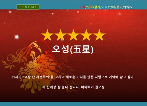 G E N O M E 노력/실적/평가/가치/판매/등기/양수도 오성(五星) 21세기 “고장 난 자본주의”를 고치고 새로운 가치를 만든 사람으로 기억에 남고 싶다. 저 한세상 잘 놀다 갑니다. 빠이빠이 권오성