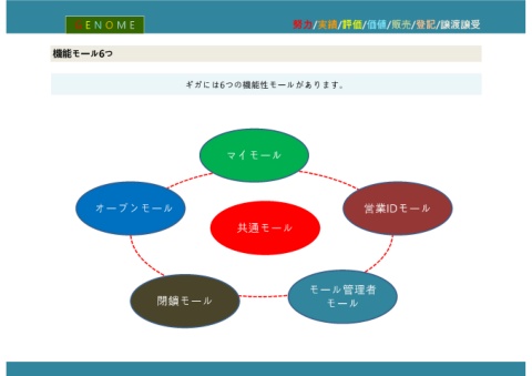 G E N O M E 努力/実績/評価/価値/販売/登記/譲渡譲受 機 能 モ ー ル 6 つ 機能モール6つ ギガには6つの機能性モールがあります。 ギ ガ に は 6 つ の 機 能 性 モ ー ル が あ り ま す 。 マイモール オープンモール 営業IDモール 共通モール モール管理者 閉鎖モール モール