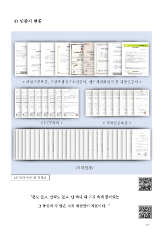 4) 인증서 현황 < 사업자등록증, 기업부설연구소인증서, 벤처기업확인서 등 각종인증서 > < PCT특허 > < 저작권등록증 > <특허현황> 137개의 특허 및 저작권 “돈도 없고, 인력도 없고, 단 하나 내 머리 속에 들어있는 그 동안의 수 많은 지적 재산만이 자본이다.“ 283
