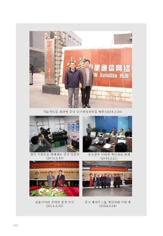 기술지도를 위하여 중국 국가위성센터를 방문(2014.2.18) 한국 기술진을 취재하는 중국 방송팀 중국정부 인터넷 책임자와 회의 (2014.2.19) (2014.2.21) 궈둔지이와 전략적 합작 조인 중국 베이두그룹 책임자와 미팅 후 (2014.2.21) (2014.2.24) 320