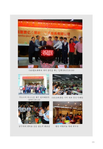 O2O발표회에서 개식 선언을 하는 일행(2015.10.10) 가오신치 연구소를 찾은 한국대표단 O2O교육장을 가득 메운 중국 인원들 (2015.10.11) 중국에서 생일을 맞은 권오석 회장님 방중 사업자들 자체 세미나 335