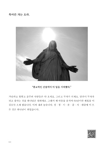 목마른 자는 오라. “종교적인 신념에서 이 일을 시작했다.” 가난하고 헐벗고 굶주린 사람들은 다 오세요. 그리고 부자가 되세요. 당신이 부자가 되고 잘사는 것을 하나님은 원하세요. 그래서 제 마음을 움직여 60년이란 세월을 이 길로만 오게 했습니다. 이제 내려 놓습니다. 정·경·사·문·종·지·재단에 이 모 든 것은 하나님이 하였습니다. 360