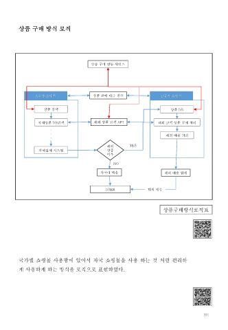 상품 구매 방식 로직 상품 구매 연동 서비스 A국가 쇼핑몰 상품 판매 대금 정산 B국가 쇼핑몰 상품 검색 상품 DB 자체상품 DB검색 해외 상품 검색 API 해외 고객 상품 구매 처리 . . . 해외 배송 의뢰 해외 YES 자체결제 시스템 상품 여부 NO 자국내 배송 해외 배송 업체 USER 해외 배송 상품구매방식로직표 국가별 쇼핑몰 사용함에 있어서 자국 쇼핑몰을 사용 하는 것 처럼 편리하 게 사용하게 하는 방식을 로직으로 표현하였다. 391