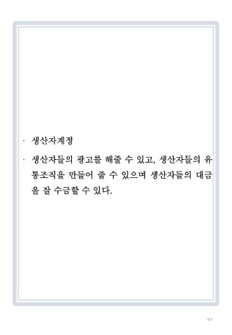 · 생산자계정 · 생산자들의 광고를 해줄 수 있고, 생산자들의 유 통조직을 만들어 줄 수 있으며 생산자들의 대금 을 잘 수금할 수 있다. 427