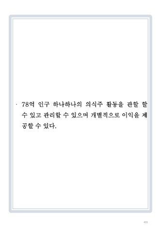 · 78억 인구 하나하나의 의식주 활동을 관할 할 수 있고 관리할 수 있으며 개별적으로 이익을 제 공할 수 있다. 433