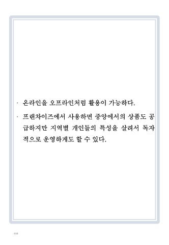 · 온라인을 오프라인처럼 활용이 가능하다. · 프랜차이즈에서 사용하면 중앙에서의 상품도 공 급하지만 지역별 개인들의 특성을 살려서 독자 적으로 운영하게도 할 수 있다. 438