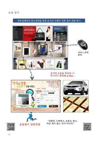 보물 찾기 제휴업체와의 광고전략을 통한 숨겨진 이벤트 상품 찾아 선물 받기 마우스 클릭, 클릭.. 숨겨진 보물을 찾아라~!! 마구마구 클릭해 보세요~ “상품을 구매하고, 보물도 찾고, 보물찾기 상품당첨 여간 재미 있는 것이 아니다.” 488
