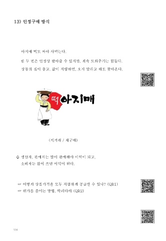 13) 인정구매 방식 아지매 떡도 싸야 사먹는다. 한 두 번은 인정상 팔아줄 수 있지만, 계속 도와주기는 힘들다. 상품의 질이 좋고, 값이 저렴하면, 오지 말라고 해도 찾아온다. (직거래 / 재구매) ♤ 생산자, 판매자는 많이 판매해야 이익이 되고, 소비자는 많이 쓰면 이익이 된다. ☞ 어떻게 상품가격을 모두 저렴하게 공급할 수 있나? (QR1) ☞ 원가를 줄이는 방법, 박리다매 (QR2) 504