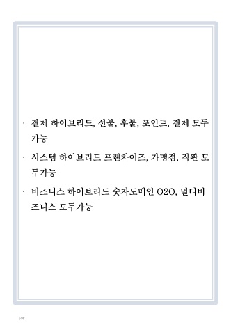 · 결제 하이브리드, 선불, 후불, 포인트, 결제 모두 가능 · 시스템 하이브리드 프랜차이즈, 가맹점, 직판 모 두가능 · 비즈니스 하이브리드 숫자도메인 O2O, 멀티비 즈니스 모두가능 508