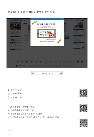 보물찾기를 통하여 재미도 있고 이익도 있고… ❖ 보 물 찾 기 ❖ ♤ 보물과 행운 ♤ 보물과 축복 ♤ 보물과 기쁨 ☞ 보물찾기의 사용방법 (QR1) ☞ 보물찾기란 무엇인가? (QR2) ☞ 보물찾기의 장점은 무엇인가? (QR3) ☞ 기업들이 보물찾기를 했을 때 얻을 수 있는 혜택은? (QR4) 520