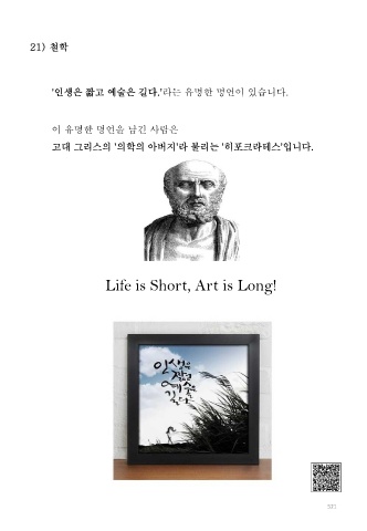 21) 철학 '인생은 짧고 예술은 길다.'라는 유명한 명언이 있습니다. 이 유명한 명언을 남긴 사람은 고대 그리스의 '의학의 아버지'라 불리는 '히포크라테스'입니다. Life is Short, Art is Long! 521