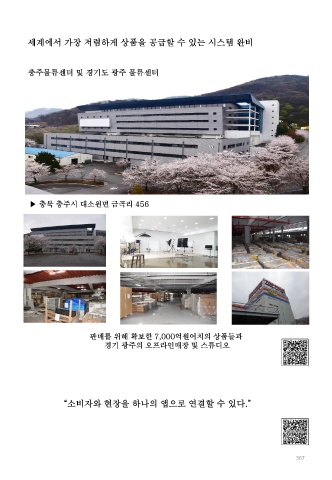 세계에서 가장 저렴하게 상품을 공급할 수 있는 시스템 완비 충주물류센터 및 경기도 광주 물류센터 ▶ 충북 충주시 대소원면 금곡리 456 판매를 위해 확보한 7,000억원어치의 상품들과 경기 광주의 오프라인매장 및 스튜디오 “소비자와 현장을 하나의 앱으로 연결할 수 있다.” 567