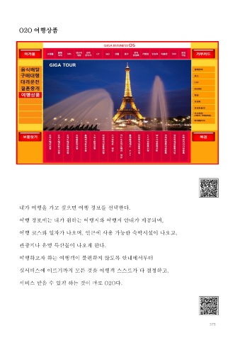O2O 여행상품 내가 여행을 가고 싶으면 여행 정보를 선택한다. 여행 정보에는 내가 원하는 여행지와 여행지 안내가 제공되며, 여행 코스와 일자가 나오며, 인근에 사용 가능한 숙박시설이 나오고, 관광지나 유명 특산물이 나오게 한다. 여행하고자 하는 여행객이 불편하지 않도록 안내에서부터 실서비스에 이르기까지 모든 것을 여행객 스스로가 다 결정하고, 서비스 받을 수 있게 하는 것이 바로 O2O다. 573