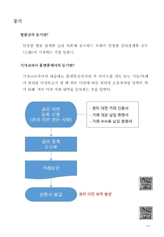 등기 법률상의 등기란? 일정한 법률 관계를 널리 사회에 공시하기 위하여 일정한 권리관계를 공부 (公簿)에 기재하는 것을 말한다. 기가코리아 플랫폼에서의 등기란? 기가코리아에서 제공하는 플랫폼상에서의 각 서비스를 개인 또는 기업/단체 가 권리를 이전하고자 할 때 권리 이전에 따른 권리의 소유권자를 명확히 하 기 위해 권리 이전 거래 내역을 등록하는 것을 말한다. 615