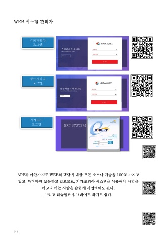 WEB 시스템 관리자 슈퍼관리자 로그인 생산관리자 로그인 기가ERP 로그인 ERP SYSTEM APP과 마찬가지로 WEB의 백단에 대한 모든 소스나 기술을 100% 가지고 있고, 특허까지 보유하고 있으므로, 기가코리아 시스템을 이용해서 사업을 하고자 하는 사람은 손쉽게 사업하여도 된다. 그리고 리뉴얼과 업그레이드 하기도 쉽다. 642