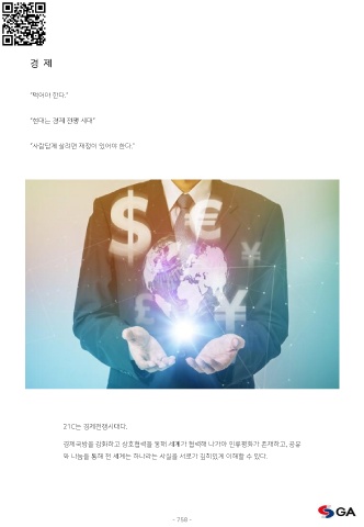 경 제 “먹어야 한다.” “현대는 경제 전쟁 시대” “사람답게 살려면 재정이 있어야 한다.” 21C는 경제전쟁시대다. 경제국방을 강화하고 상호협력을 통해 세계가 협력해 나가야 인류평화가 존재하고, 공유 와 나눔을 통해 전 세계는 하나라는 사실을 서로가 깊히있게 이해할 수 있다. - 758 -