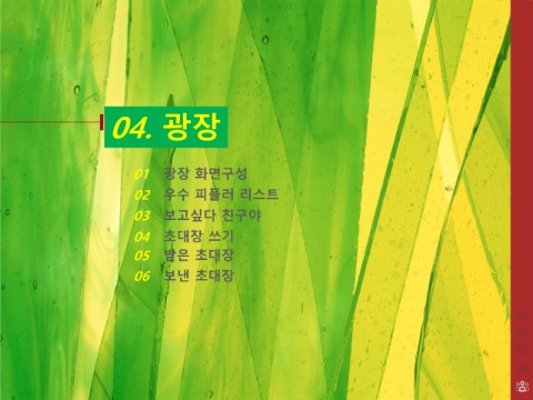 04. 광장 01 광장 화면구성 02 우수 피플러 리스트 03 보고싶다 친구야 04 초대장 쓰기 05 받은 초대장 06 보낸 초대장
