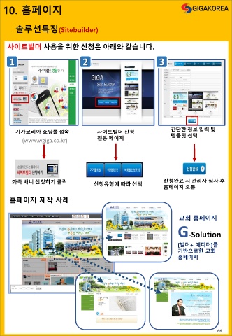 10. 홈페이지 솔루션특징(Sitebuilder) 사이트빌더 사용을 위한 신청은 아래와 같습니다. 1 2 3 기가코리아 쇼핑몰 접속 사이트빌더 신청 간단한 정보 입력 및 템플릿 선택 (www.wgiga.co.kr) 전용 페이지 좌측 배너 신청하기 클릭 신청유형에 따라 선택 신청완료 시 관리자 심사 후 홈페이지 오픈 홈페이지 제작 사례 교회 홈페이지 G-Solution [빌더+ 에디터]를 기반으로한 교회 홈페이지 66